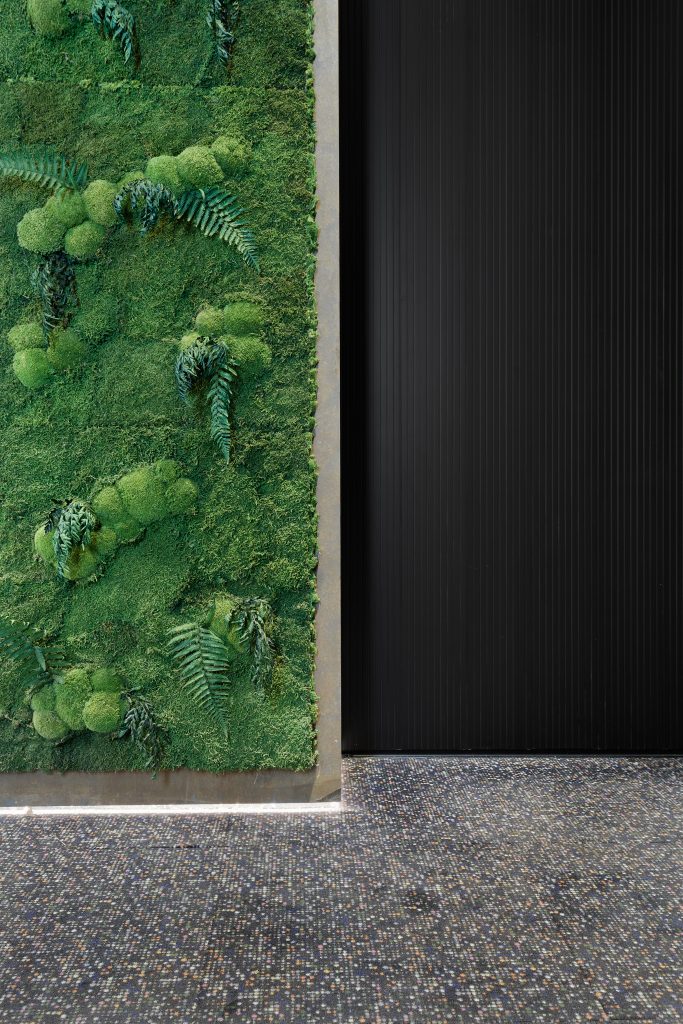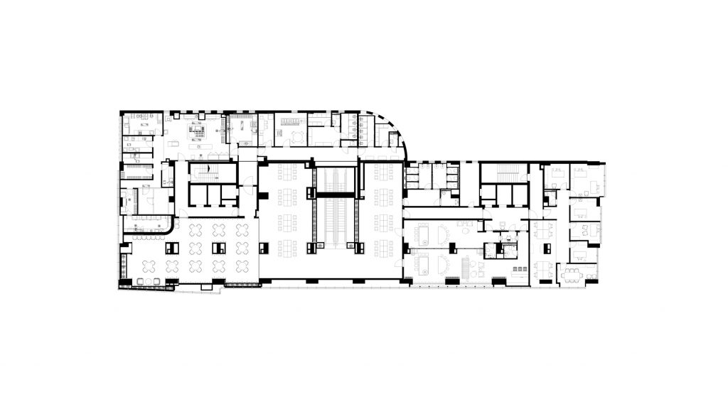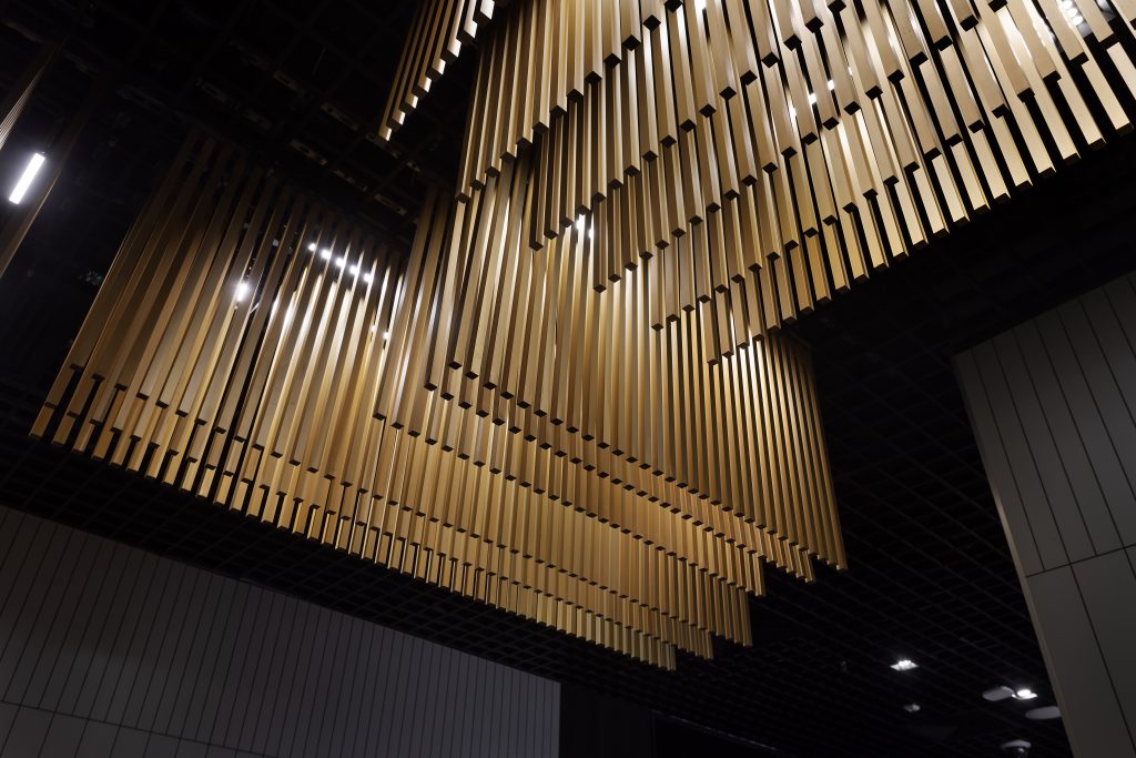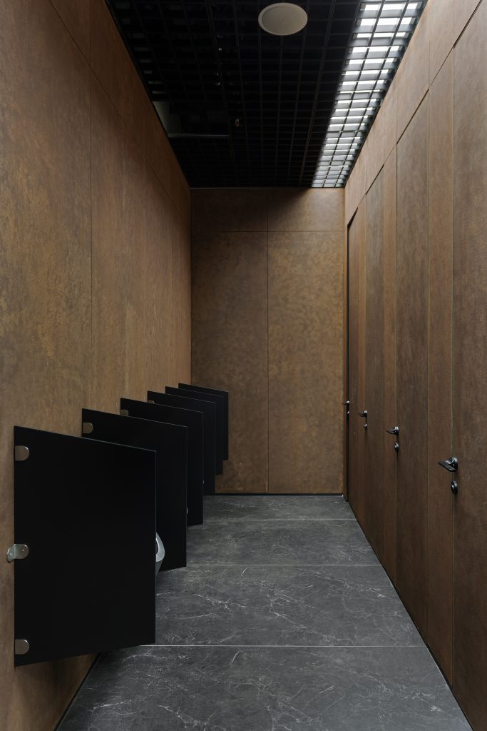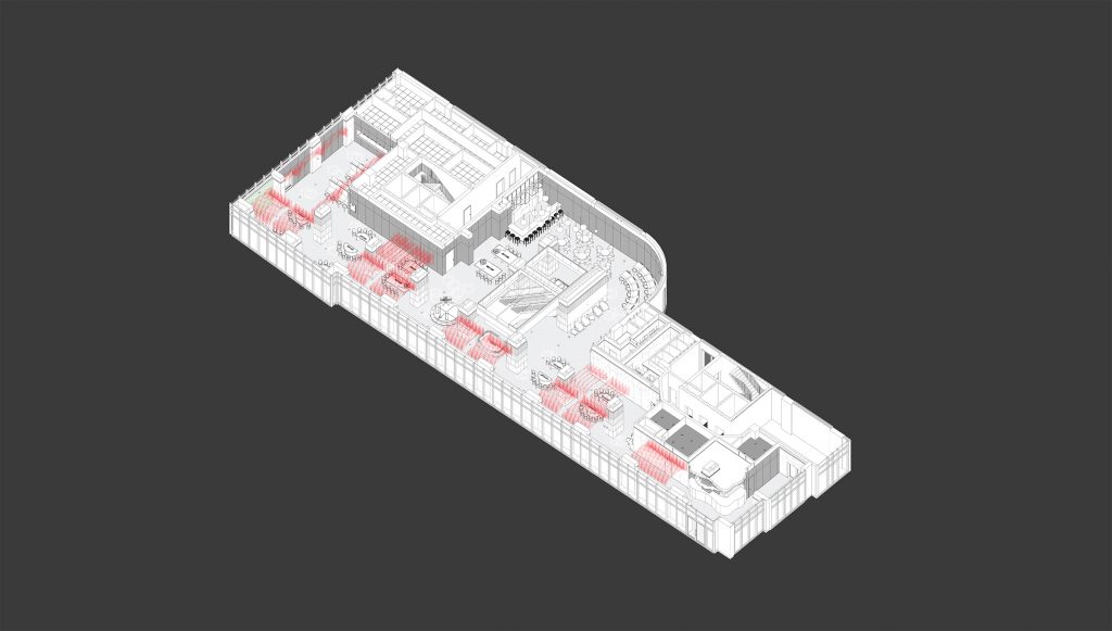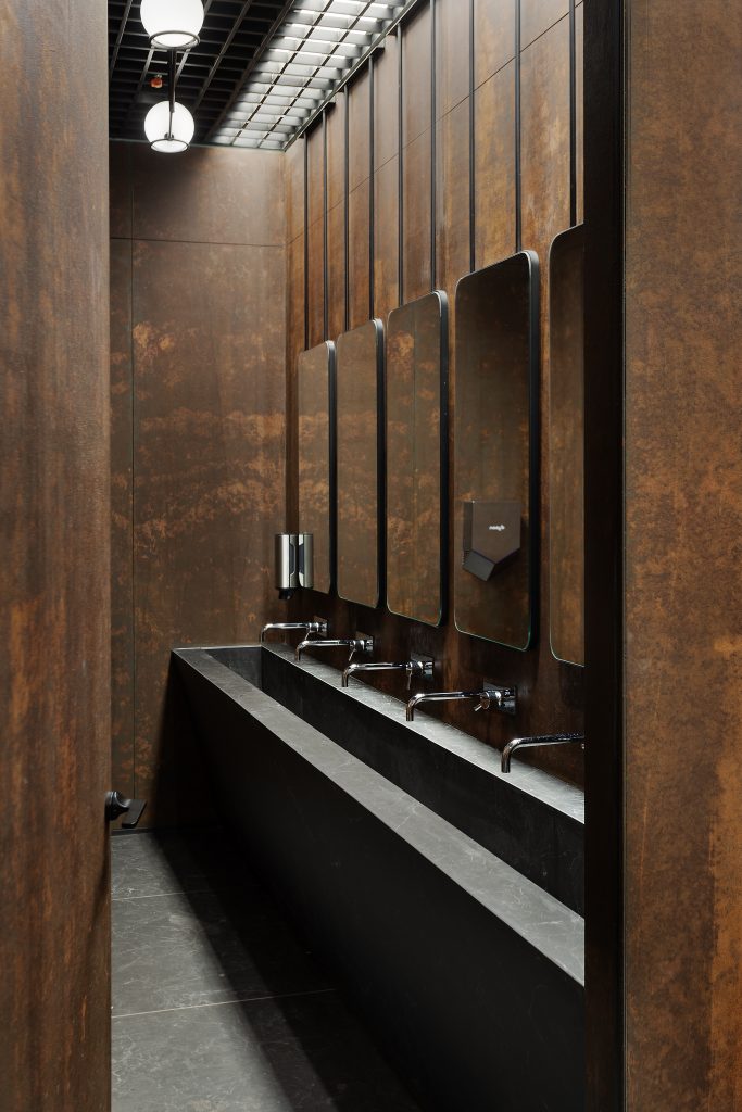 The ceiling is constructed of expanded mesh. Mechanical, electrical, and plumbing systems remain visible behind it, integrated as part of the composition rather than hidden. Black mesh defines the industrial character of the space, while lighting, ventilation, and safety systems are seamlessly incorporated. Wood finishes add subtle warmth, softening the overall palette.