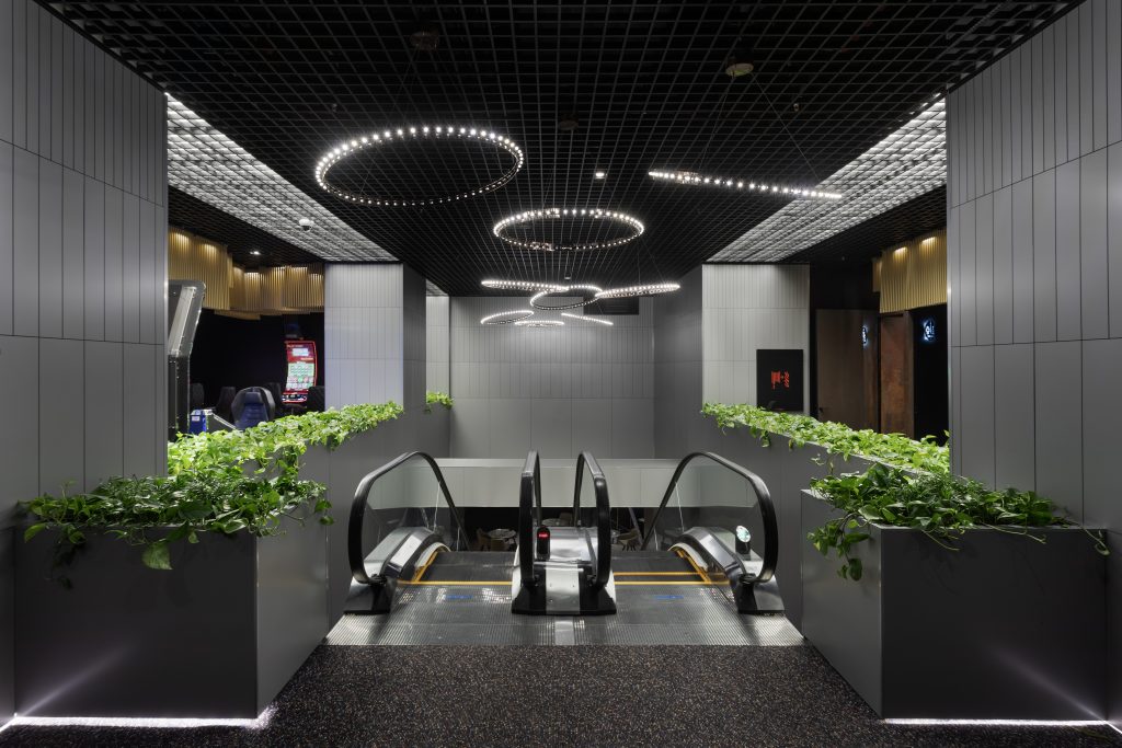 The vertical connection between levels is defined by a transparent escalator, maintaining openness and continuity. On the second floor, zones are clearly organized: slots, VIP areas, restaurant, and operational spaces. The restaurant is the only space with natural daylight, enhanced by wood and planting, including a small chili garden that introduces a subtle ecological and culinary dimension.
