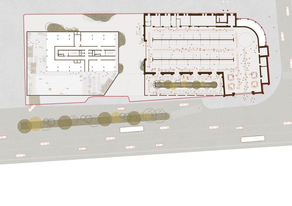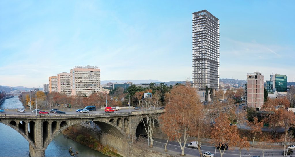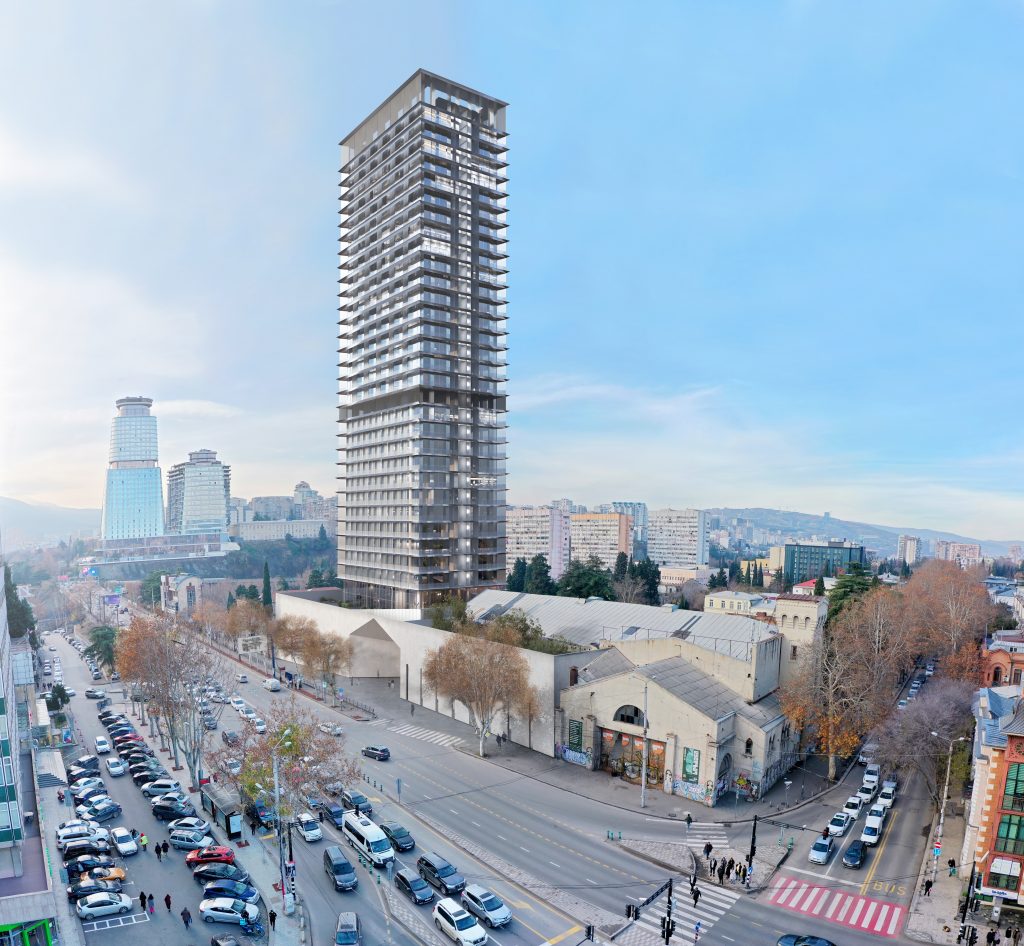 The project site is at 164 David Agmashenebeli Avenue, within Tbilisi’s historic regulatory zone, and includes an old cinema pavilion listed as a cultural heritage monument. The design responds both to the client’s brief and the challenge of integrating a new building and pedestal with the historic structure, maintaining a human scale and contextual sensitivity.