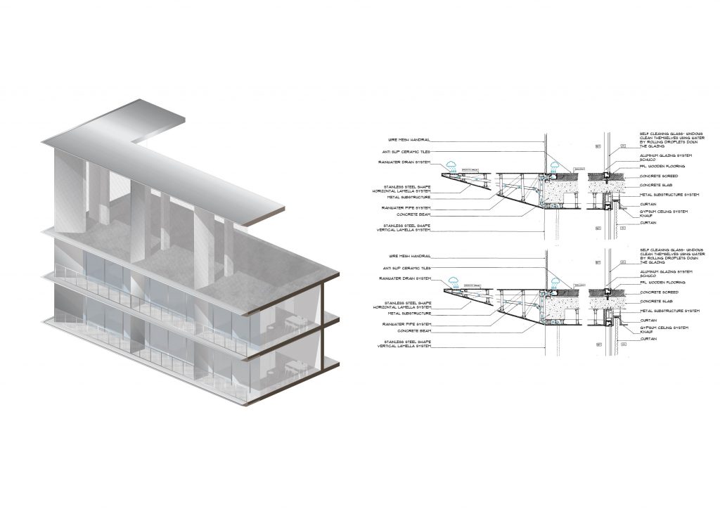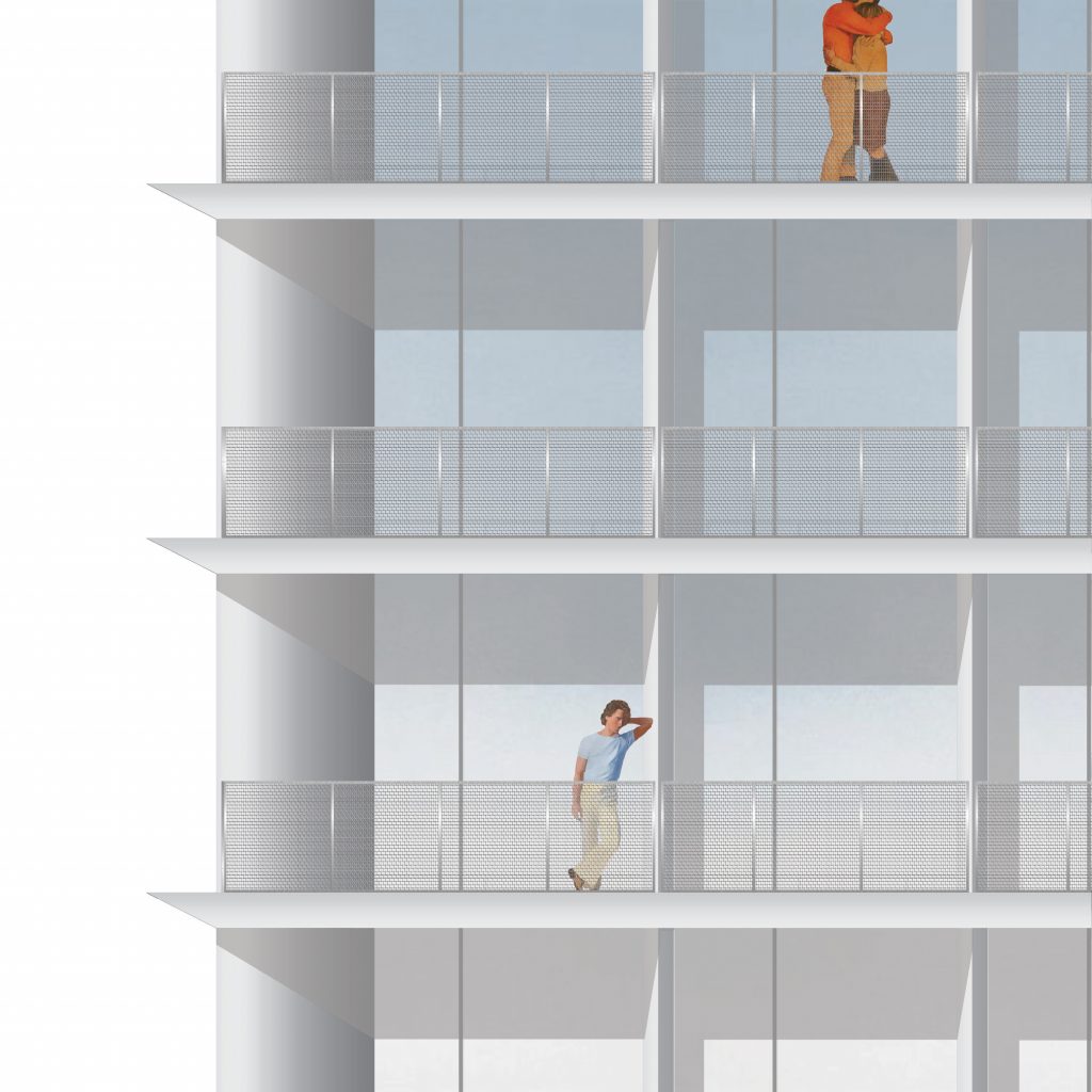 The upper building is simple and modular, allowing varied apartment typologies and easy reconfiguration. Stainless steel paneling reflects light, visually reducing mass, while also collecting rainwater, combining aesthetics with sustainability.